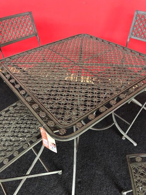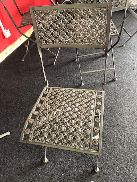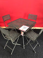 Metal table and four chair set. Ideal for any garden setting. Chairs fold away also.